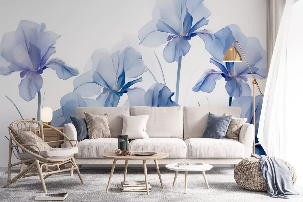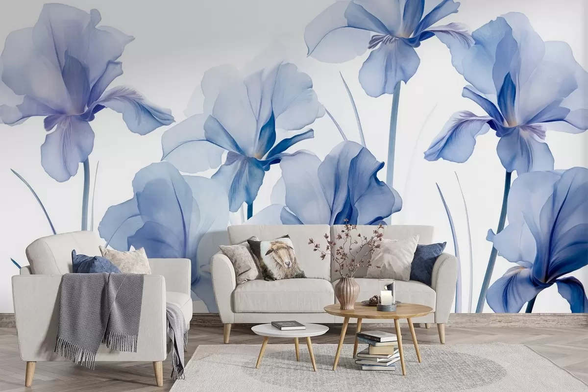 Fototapeta Niebieskie kwiaty irysa z półprzezroczystymi płatkami i długimi łodygami, ułożone w rzędzie na niebieskim tle, miękkie i teksturowane Nr w09379