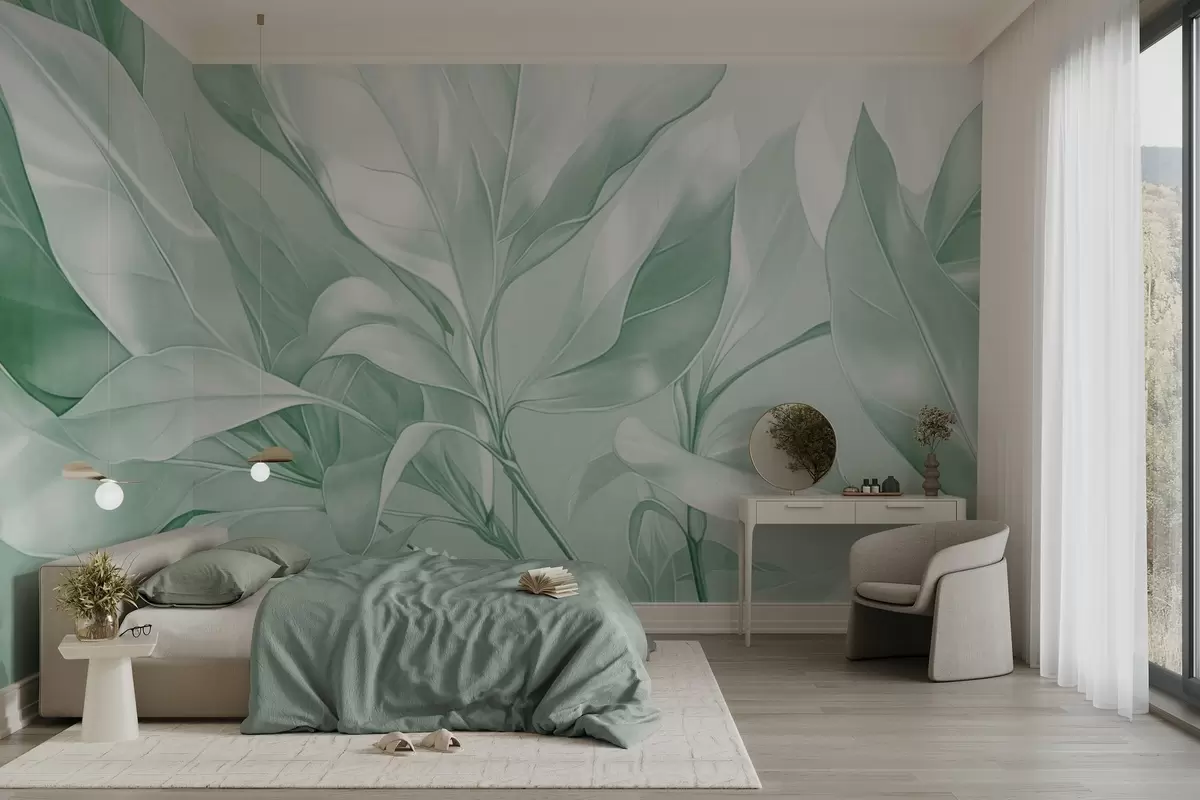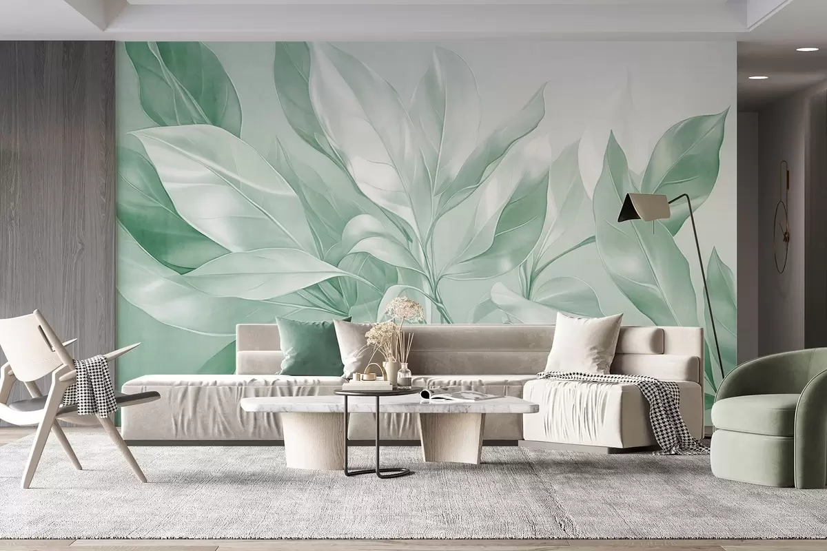 Fototapeta Liście magnolii z białymi i zielonymi odcieniami, miękkie oświetlenie, elegancka kompozycja, szczegółowe żyłki liści, artystyczne pociągnięcia pędzlem Nr w09385v1