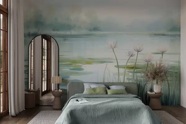 Fototapeta Krajobraz z jeziorem, liliami wodnymi i liśćmi lilii, drzewami w tle, w spokojnym otoczeniu, w jasnoniebieskich i zielonych odcieniach Nr w09395
