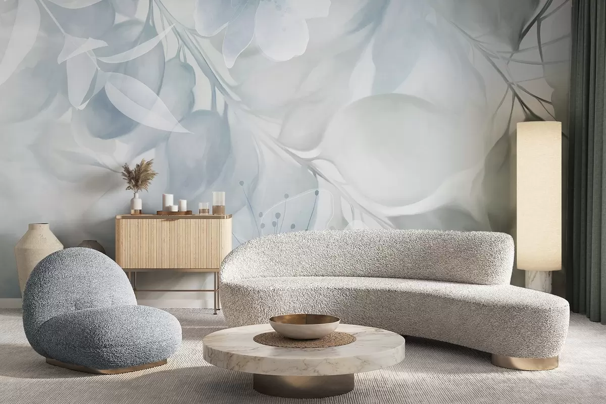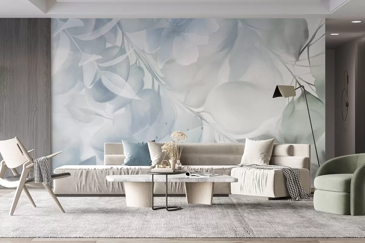 Fototapeta Sztuka kwiatowa z delikatnymi niebieskimi i zielonymi kwiatami, liśćmi i gałęziami, miękkimi pastelowymi kolorami, efektem tekstury akwareli Nr w09397v1