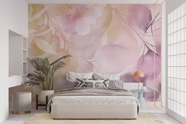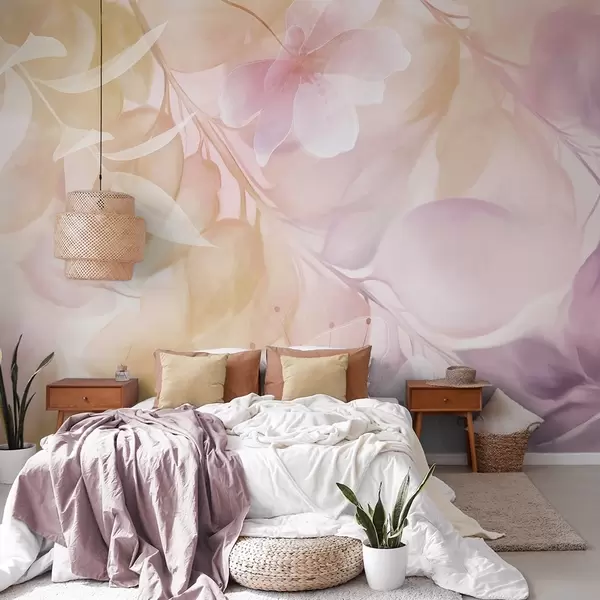 Fototapeta Sztuka kwiatowa z delikatnymi żółtymi i fioletowymi kwiatami, liśćmi i gałązkami, delikatnymi pastelowymi kolorami, efektem tekstury akwareli Nr w09397v2