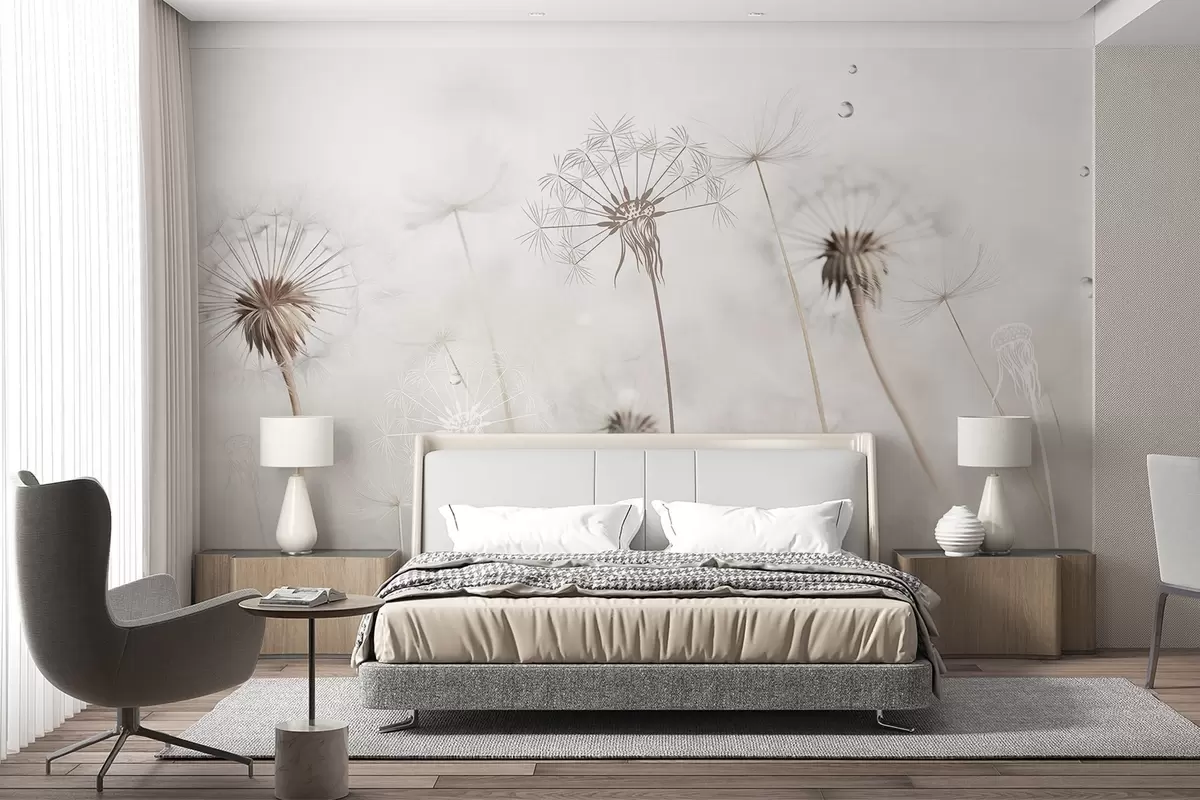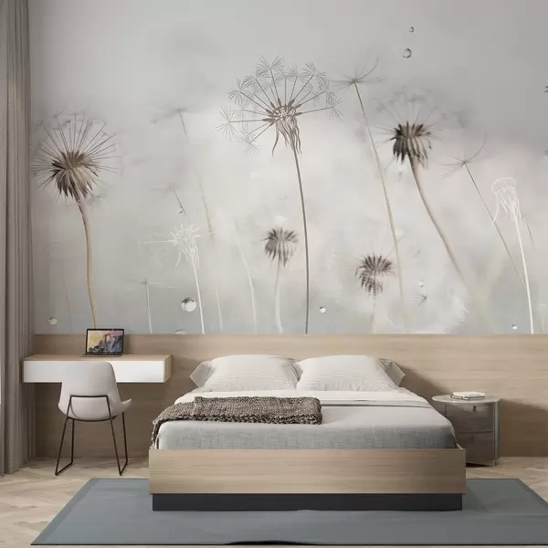 Fototapeta Mlecze z kroplami wody, białe tło, zbliżenie, miękkie światło, natura, botanika, eteryczne, delikatne, minimalistyczne Nr w09399