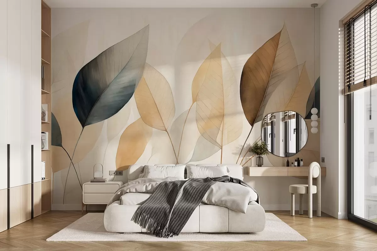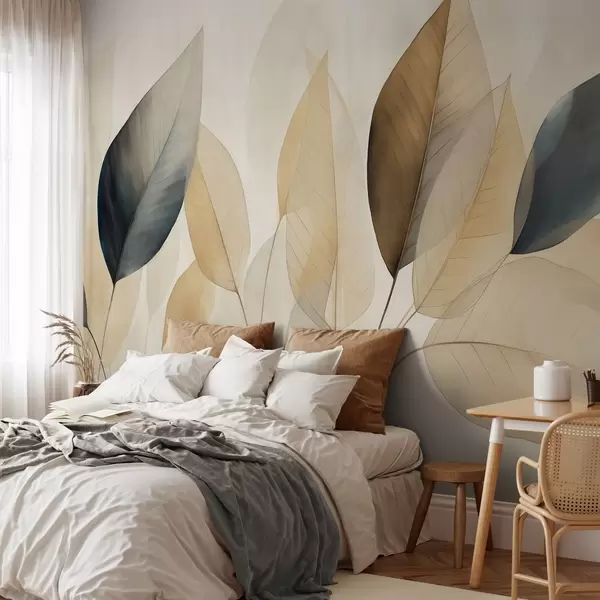 Fototapeta Teksturowane malowanie imitujące liście w odcieniach brązu, żółci i szarości, z delikatnymi żyłkami i łodygami Nr w09400