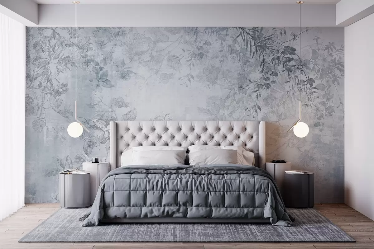 Fototapeta Vintage teksturowana grafika kwiatowa z rysunkowymi ilustracjami delikatnych ogrodowych kwiatów i liści, w delikatnych odcieniach niebieskiego Nr w09402v1