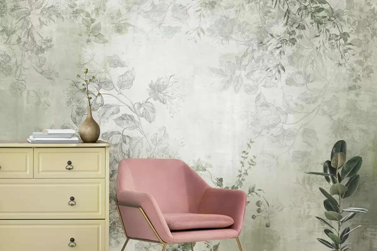 Fototapeta Vintage teksturowana grafika kwiatowa z rysunkowymi ilustracjami delikatnych ogrodowych kwiatów i liści, w delikatnych odcieniach zieleni Nr w09402v2