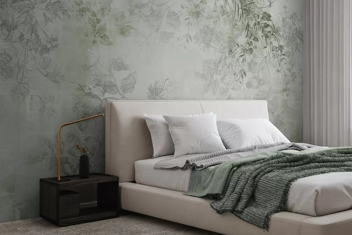 Fototapeta Vintage teksturowana grafika kwiatowa z rysunkowymi ilustracjami delikatnych ogrodowych kwiatów i liści, w delikatnych odcieniach zieleni Nr w09402v2