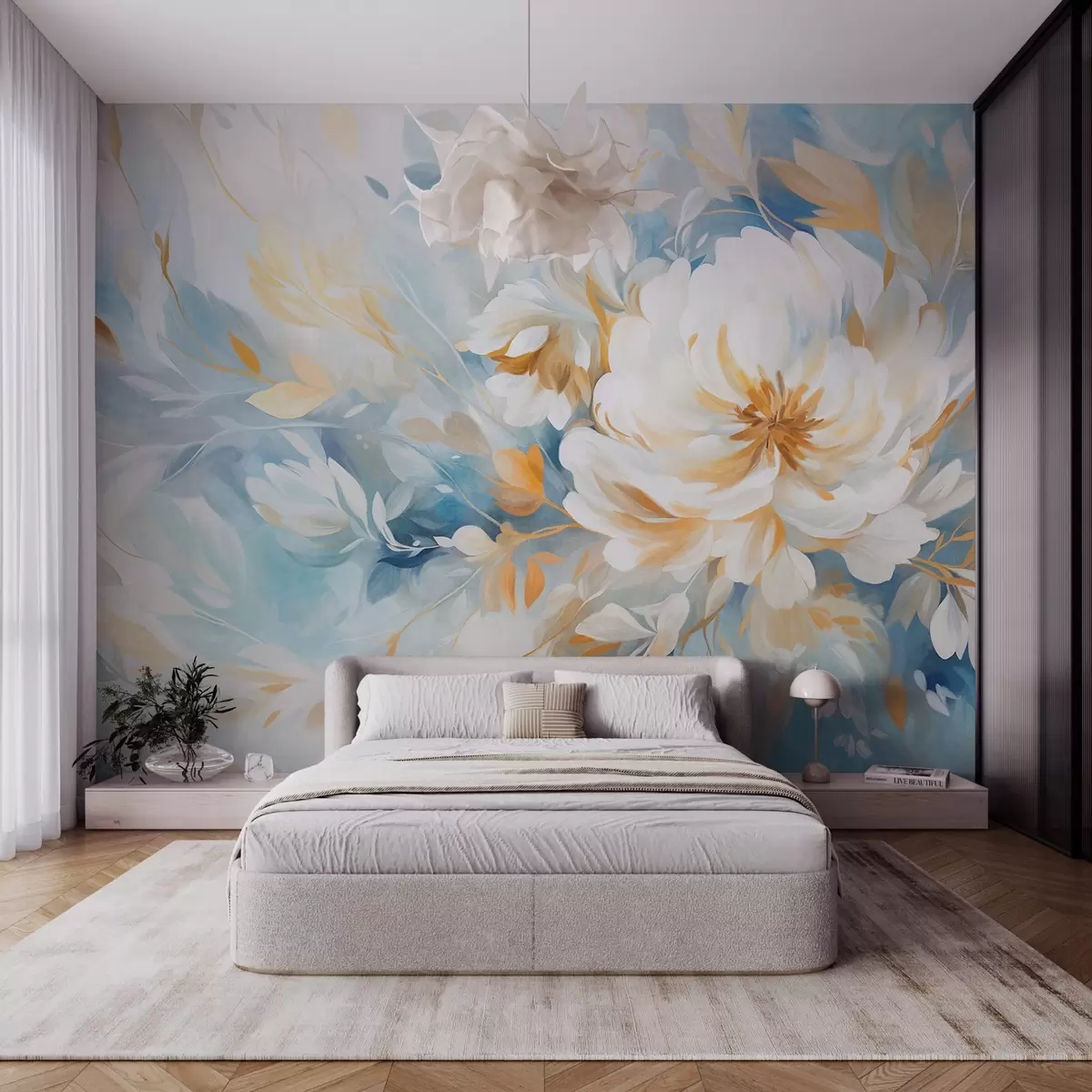 Fototapeta Teksturowany biały kwiat z niebieskimi i żółtymi detalami oraz liśćmi na niebiesko-białym abstrakcyjnym tle, styl malarski Nr w09403