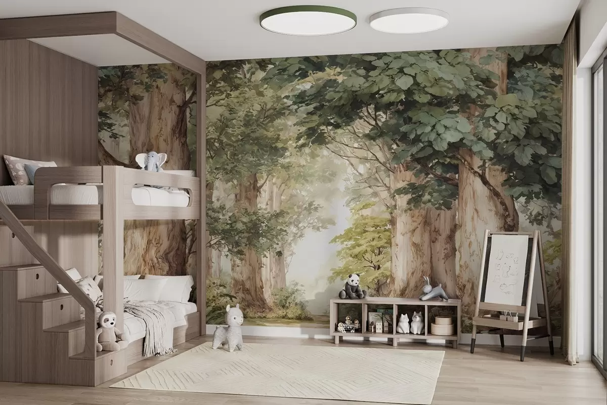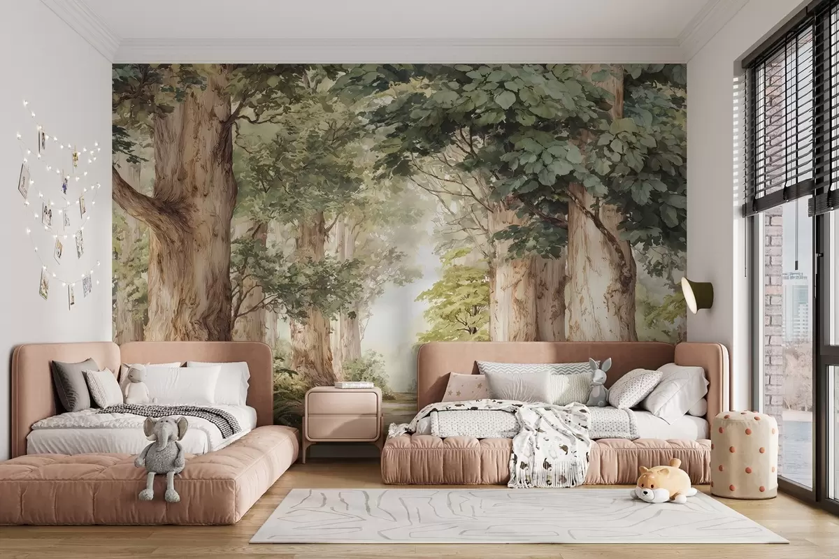 Fototapeta Leśna ścieżka wśród majestatycznych drzew w stylu akwareli Nr w09404
