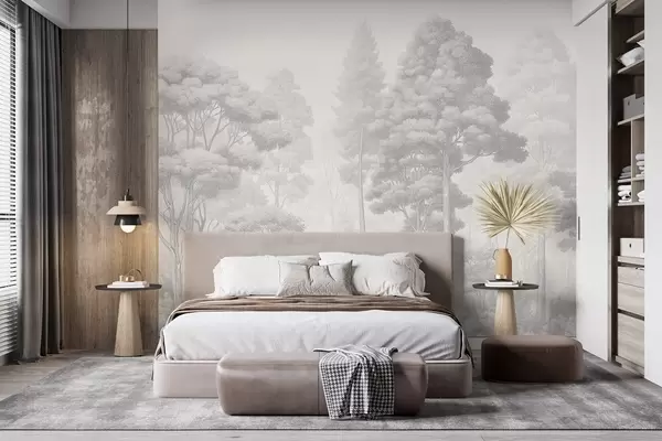 Fototapeta Artystyczny pejzaż leśny wykonany techniką czarno-białego kreskowania graficznego Nr w09411