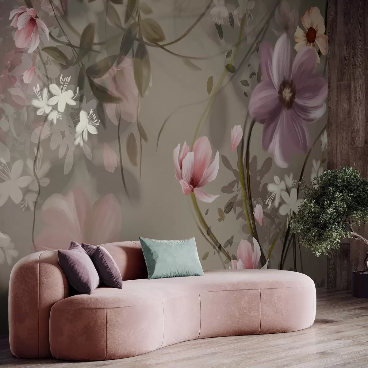 Fototapeta Różowe i białe kwiaty z brązowymi łodygami i liśćmi, delikatne oświetlenie, stonowane kolory, kompozycja kwiatowa Nr w09417