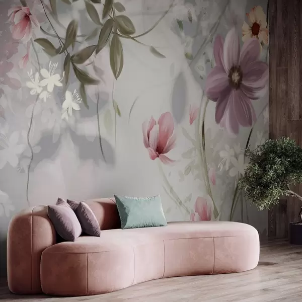 Fototapeta Różowe i białe kwiaty z zielonymi łodygami i liśćmi, delikatne oświetlenie, stonowane kolory, kompozycja kwiatowa Nr w09417v1