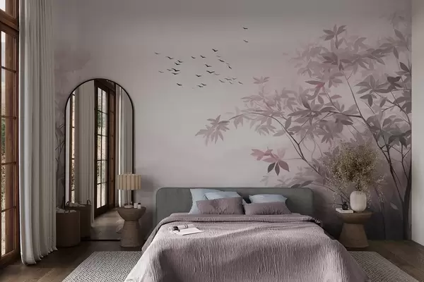 Fototapeta Teksturowany krajobraz z drzewami i stadem ptaków latających po niebie, pastelowe kolory, scena natury Nr w09418v1