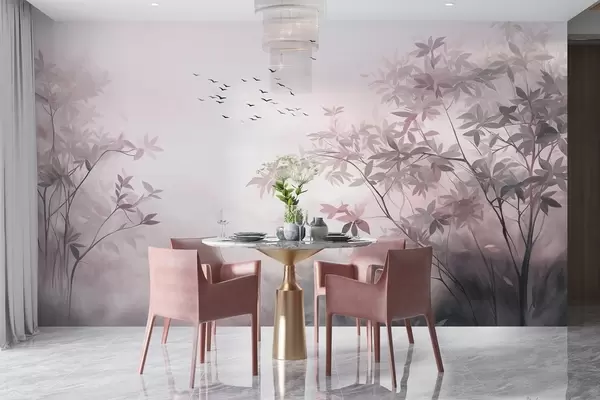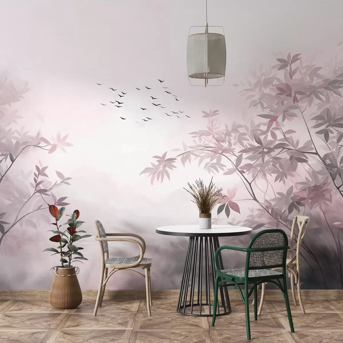 Fototapeta Teksturowany krajobraz z drzewami i stadem ptaków latających po niebie, pastelowe kolory, scena natury Nr w09418v1