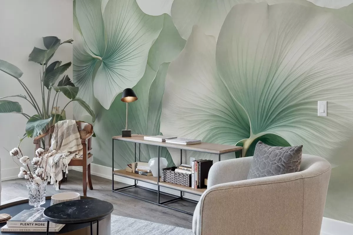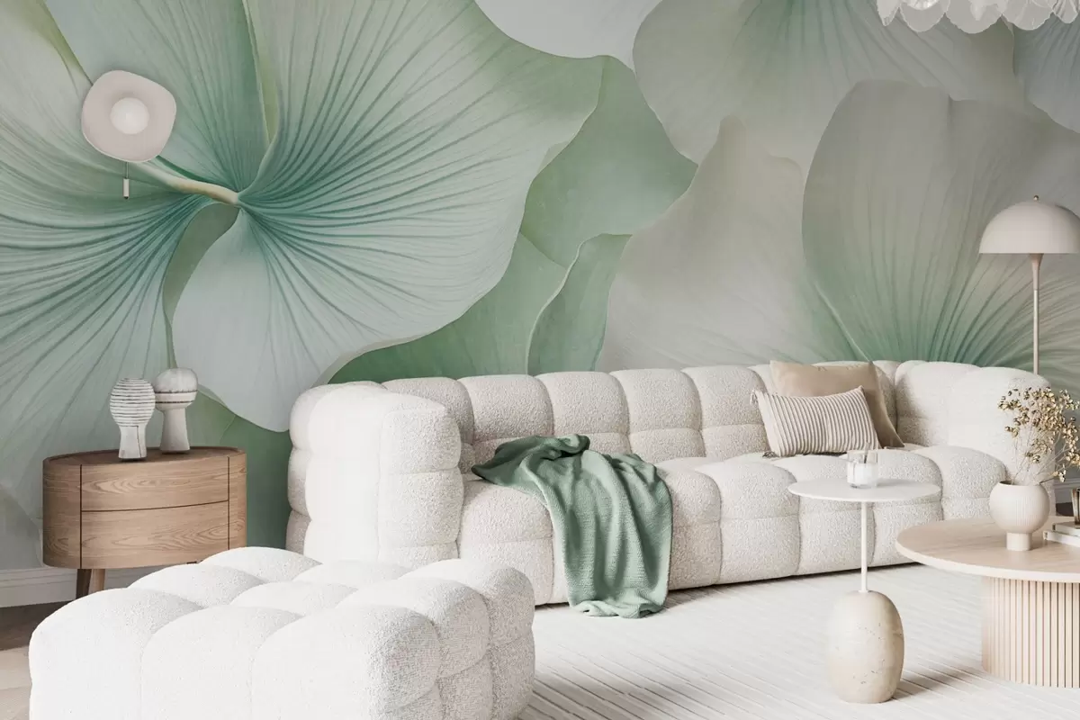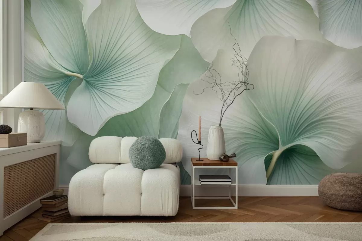 Fototapeta Białe i zielone liście miłorzębu, miękka faktura, abstrakcyjne kwiatowe tło, minimalistyczny nowoczesny styl Nr w09421