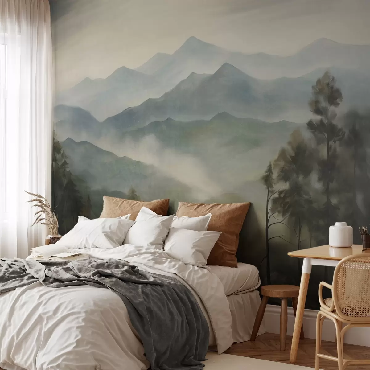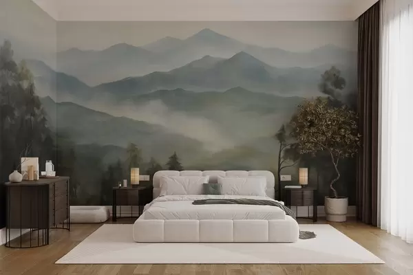 Fototapeta Zamglone pasmo górskie z drzewami, mgłą, zachmurzonym niebem, stonowanymi kolorami, styl malarstwa pejzażowego Nr w09424