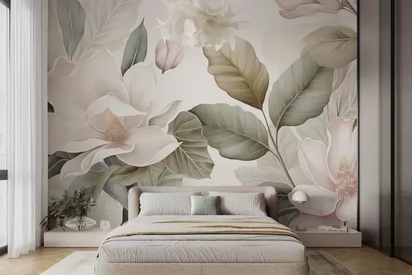 Fototapeta Kwiaty magnolii z liśćmi w pastelowych kolorach, białym, różowym i zielonym, miękkie, delikatne, w stylu akwareli Nr w09427
