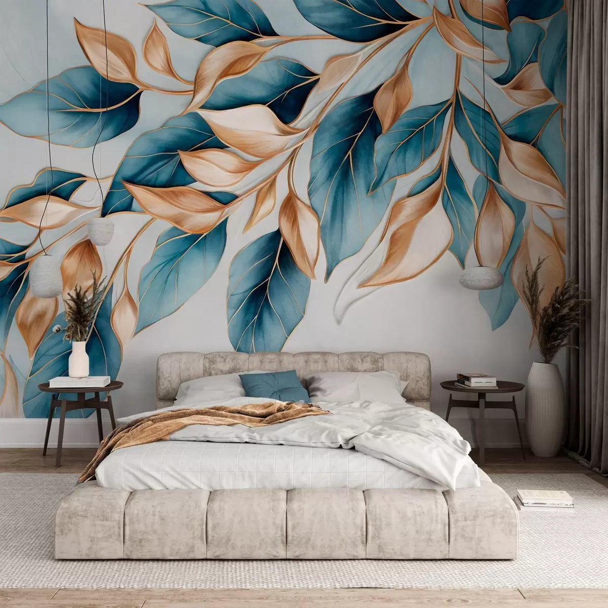 Fototapeta Teksturowane niebieskie i pomarańczowe liście, jasnoniebieskie tło, elegancki i artystyczny wzór, nowoczesny styl Nr w09429