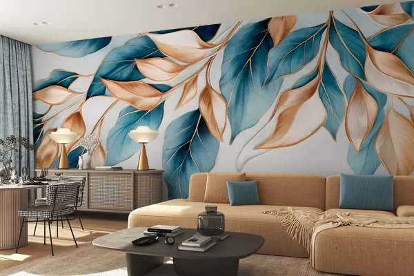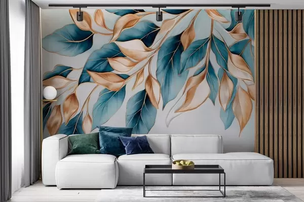 Fototapeta Teksturowane niebieskie i pomarańczowe liście, jasnoniebieskie tło, elegancki i artystyczny wzór, nowoczesny styl Nr w09429