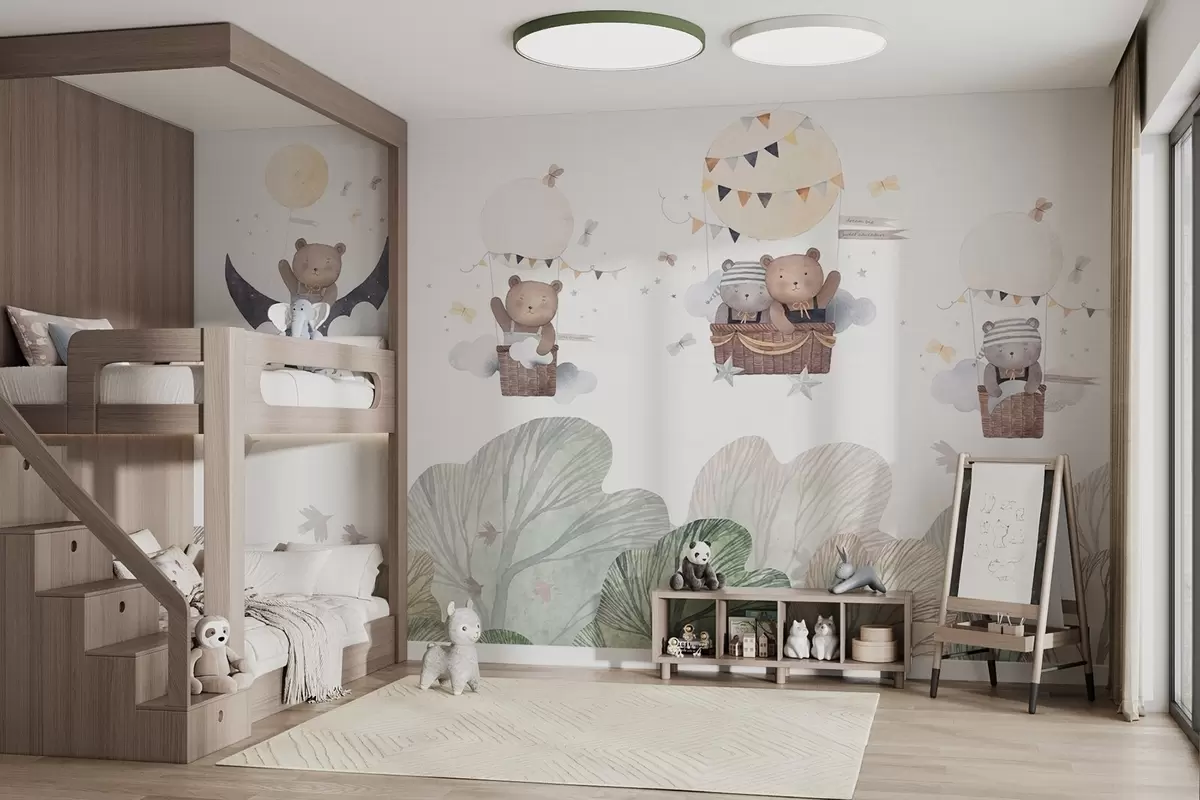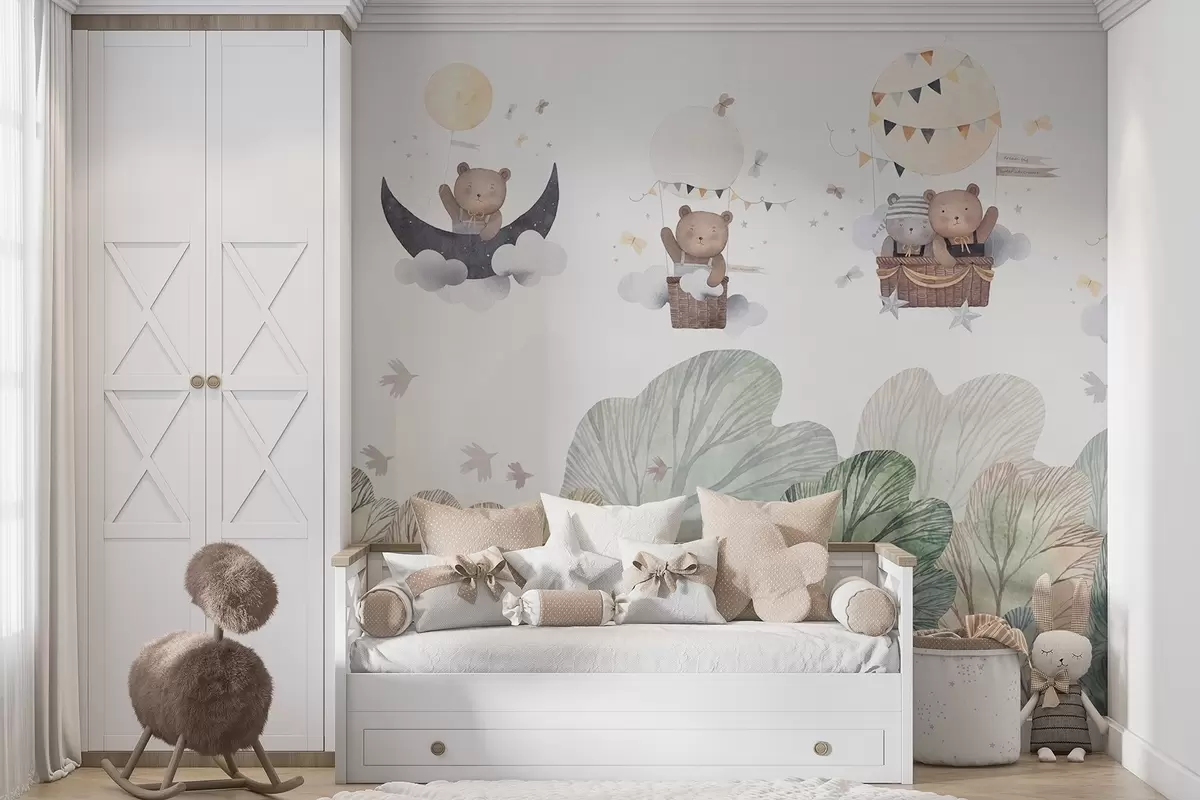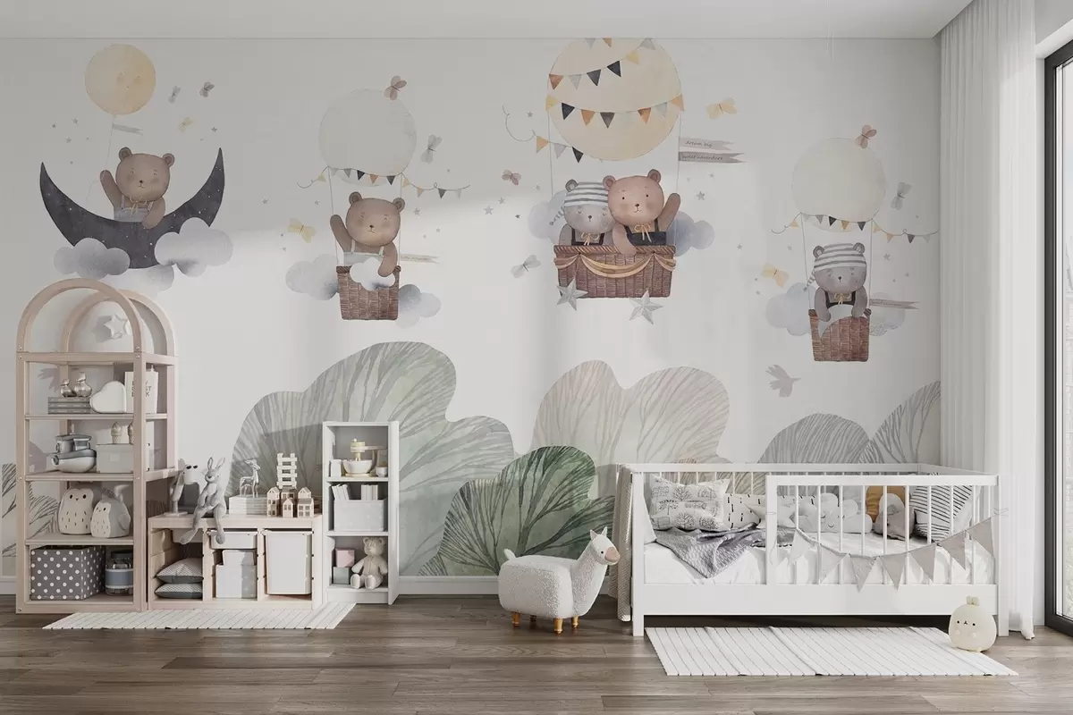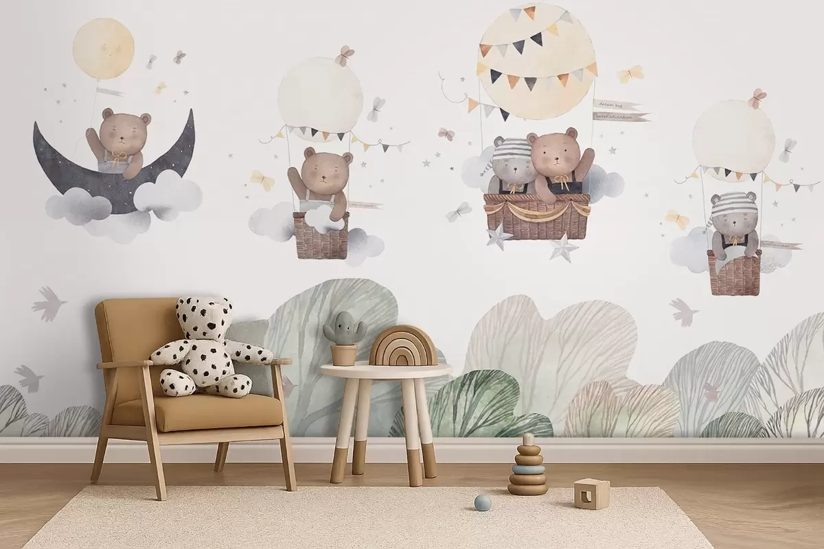 Fototapeta Balony w stylu akwareli z niedźwiedziami nad lasem Nr w09437