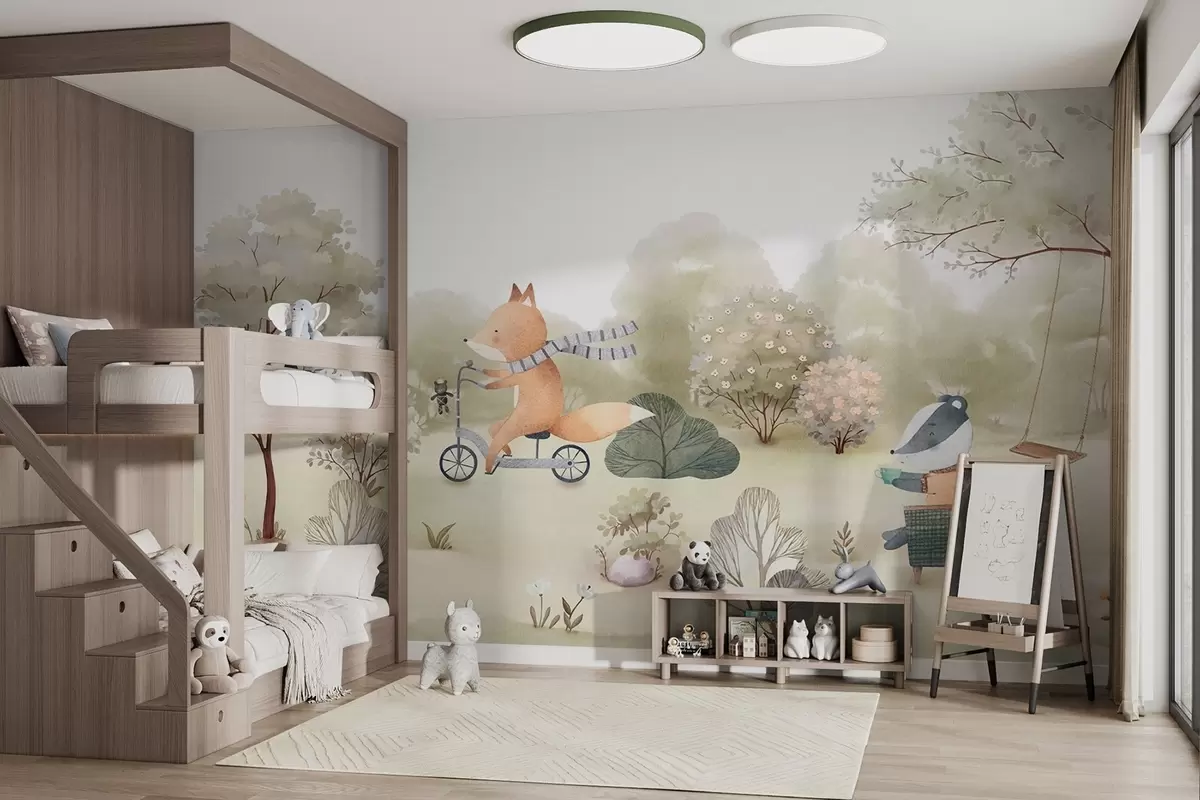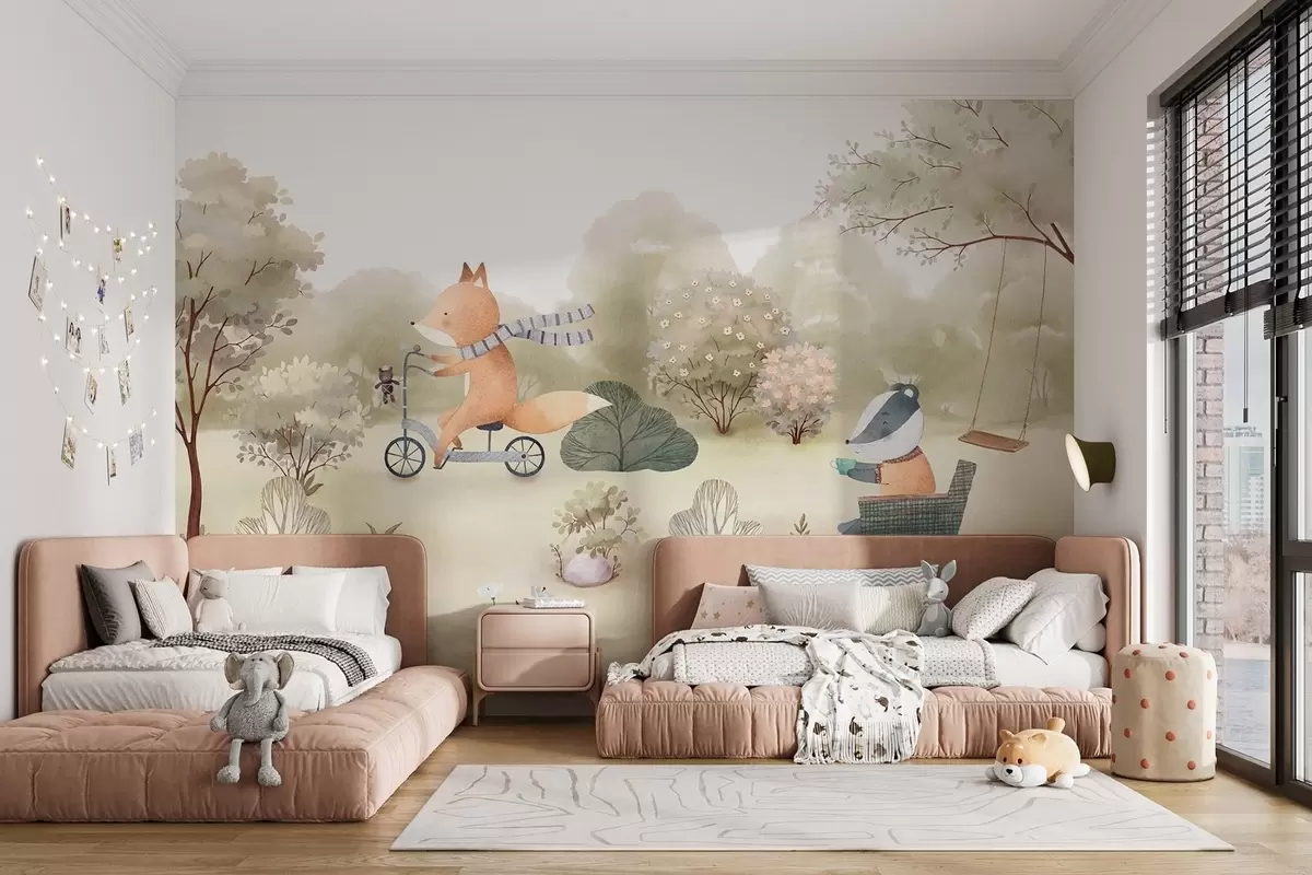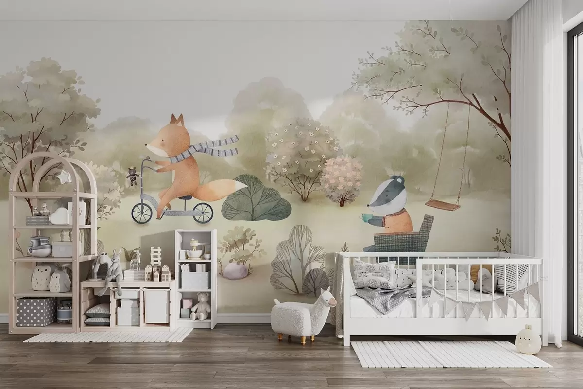 Fototapeta Lis na rowerze i borsuk z herbatą, leśne zwierzęta w stylu akwareli Nr w09439
