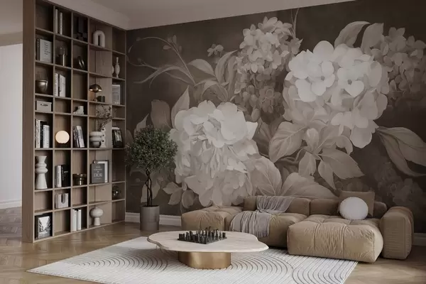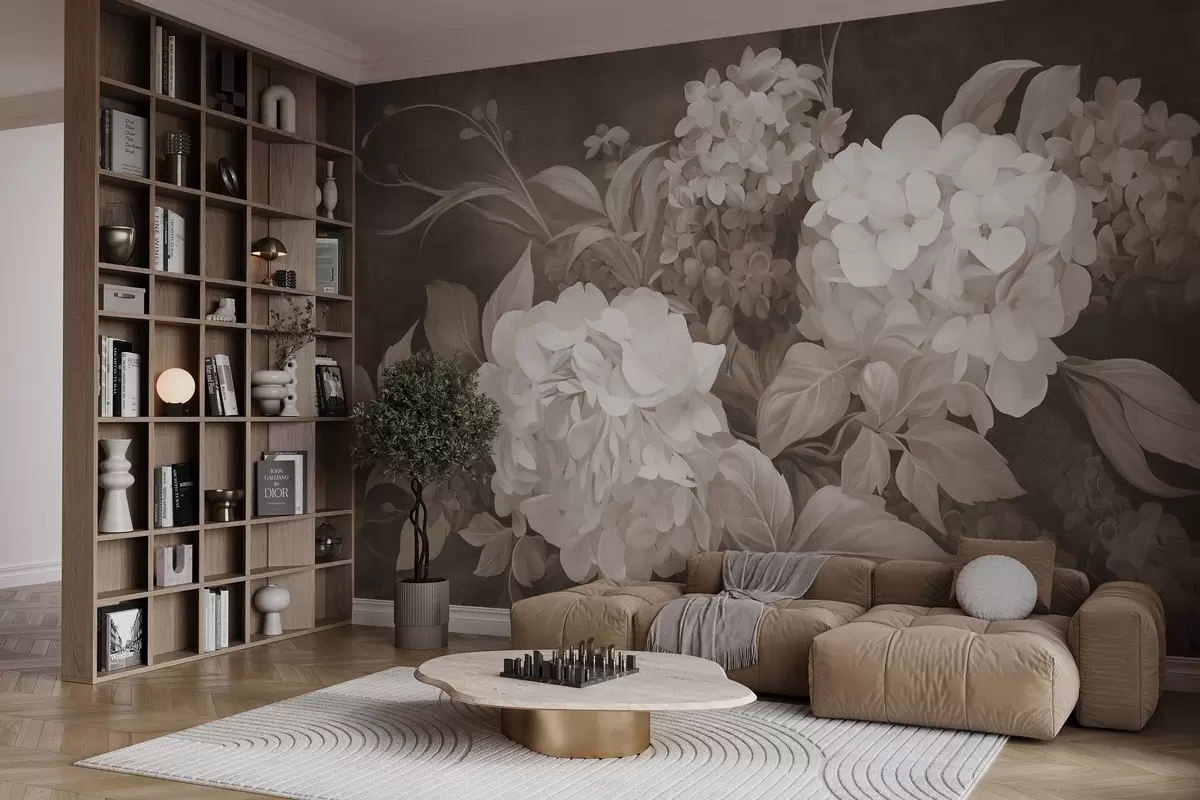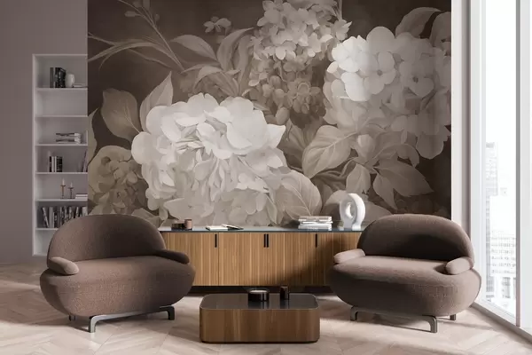 Fototapeta Teksturowany obraz w sepii imitujący kwiaty hortensji z dużymi liśćmi, abstrakcyjne i ciemne tło Nr w09465
