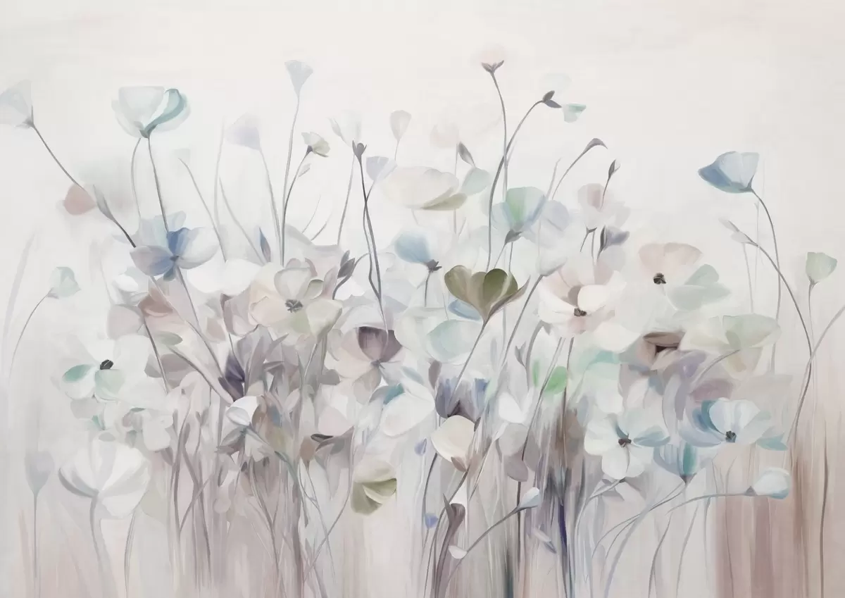 Fototapeta Abstrakcyjne pole niebieskich i brązowych kwiatów z długimi łodygami i liśćmi, teksturowane, pastelowe, stonowane kolory Nr w09466v1