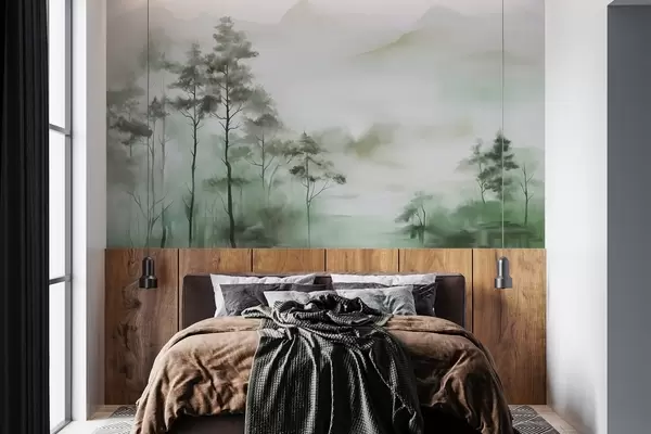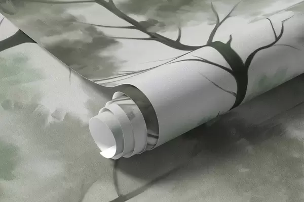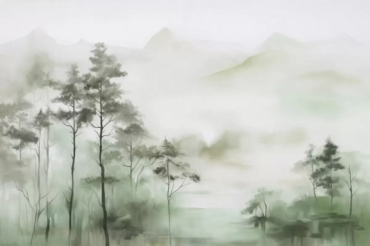 Fototapeta Mglisty krajobraz z wysokimi drzewami i górami w stonowanych odcieniach zieleni i szarości, styl minimalistyczny, teksturowany Nr w09469