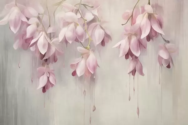Fototapeta Wiszące różowe kwiaty, jasnoszare tło, kompozycja o kwiatowej fakturze, sztuka botaniczna, pastelowe kolory Nr w09471