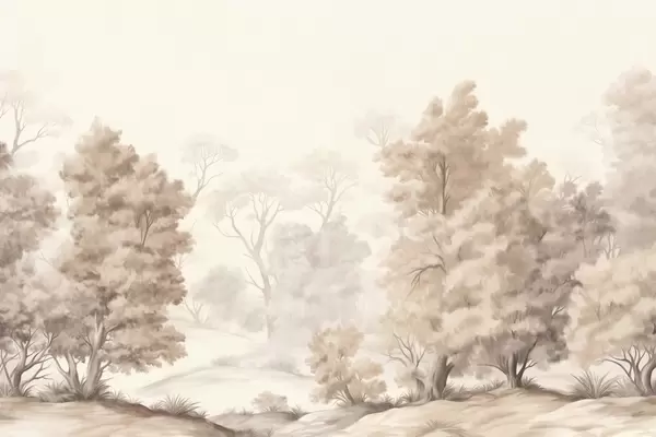 Fototapeta Teksturowany obraz krajobrazowy imitujący las z wysokimi drzewami i trawą, stonowane i delikatne kolory, uspokajająca scena Nr w09474