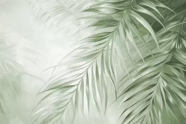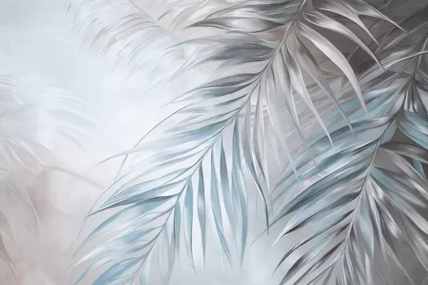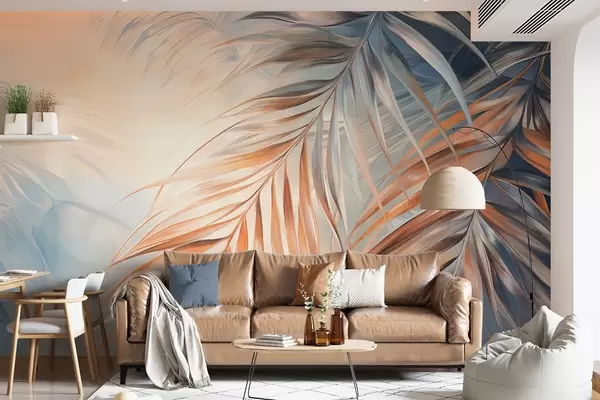 Fototapeta Liście palmowe w odcieniach pomarańczowego i niebieskiego, jasne tło o delikatnej fakturze i łagodnych kolorach, elegancki styl tropikalny Nr w09475