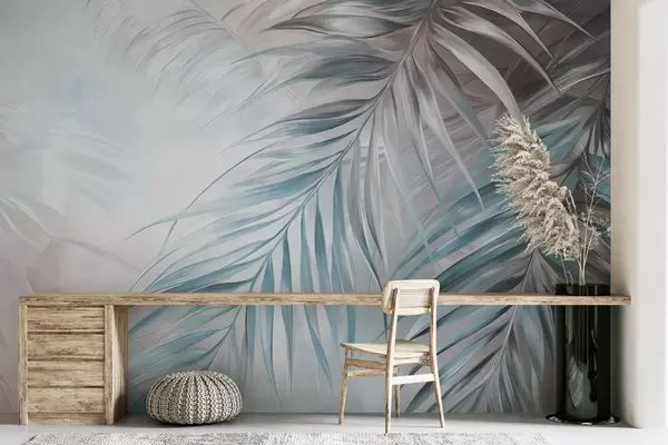 Fototapeta Liście palmowe w odcieniach szarości i błękitu, jasne tło o delikatnej fakturze i łagodnych kolorach, elegancki styl tropikalny Nr w09475v1