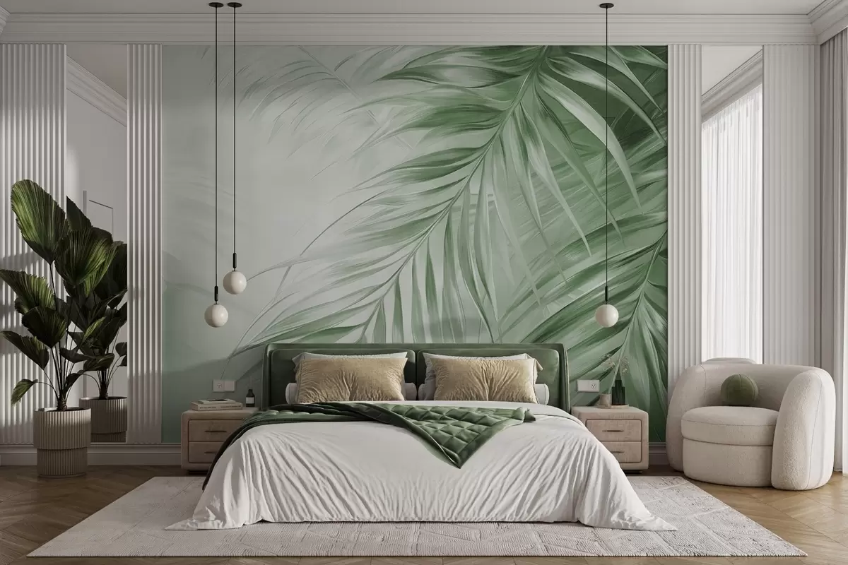 Fototapeta Liście palmowe w odcieniach zieleni, jasne tło o delikatnej fakturze i stonowanych kolorach, elegancki styl tropikalny Nr w09475v2