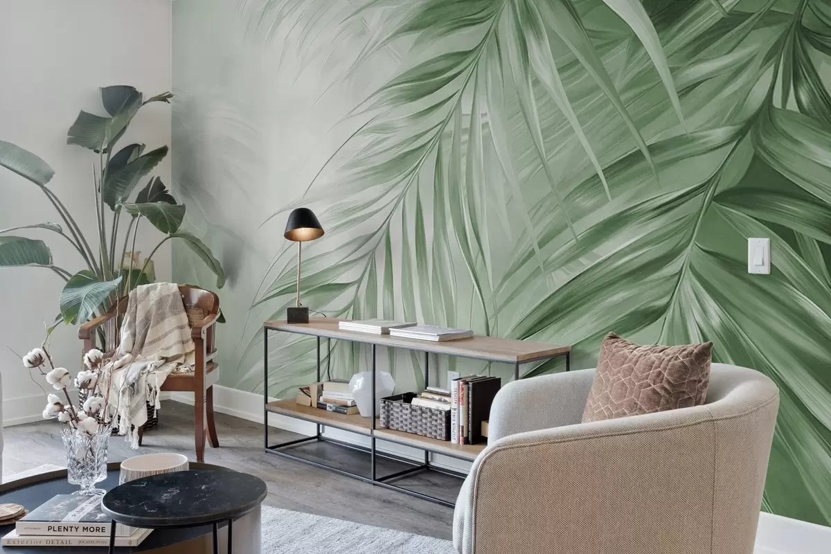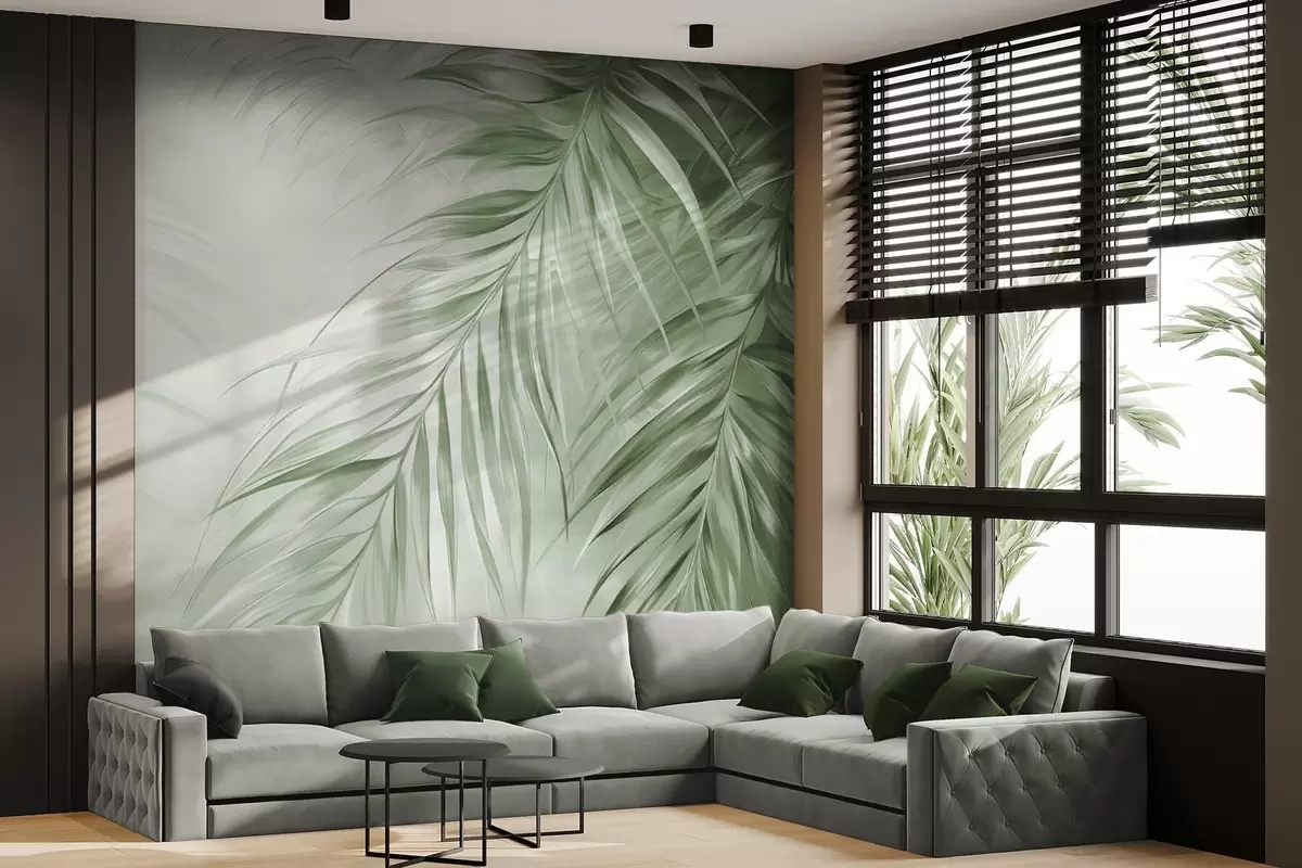 Fototapeta Liście palmowe w odcieniach zieleni, jasne tło o delikatnej fakturze i stonowanych kolorach, elegancki styl tropikalny Nr w09475v2