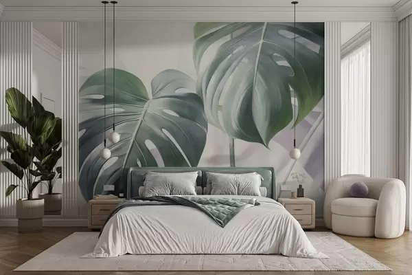 Fototapeta Teksturowane liście monstery, duże i zielone, na delikatnym, jasnym, abstrakcyjnym tle. Nr w09477