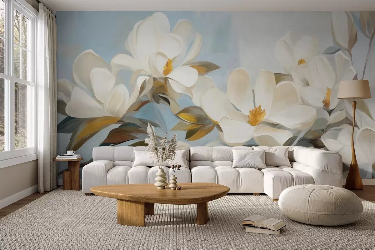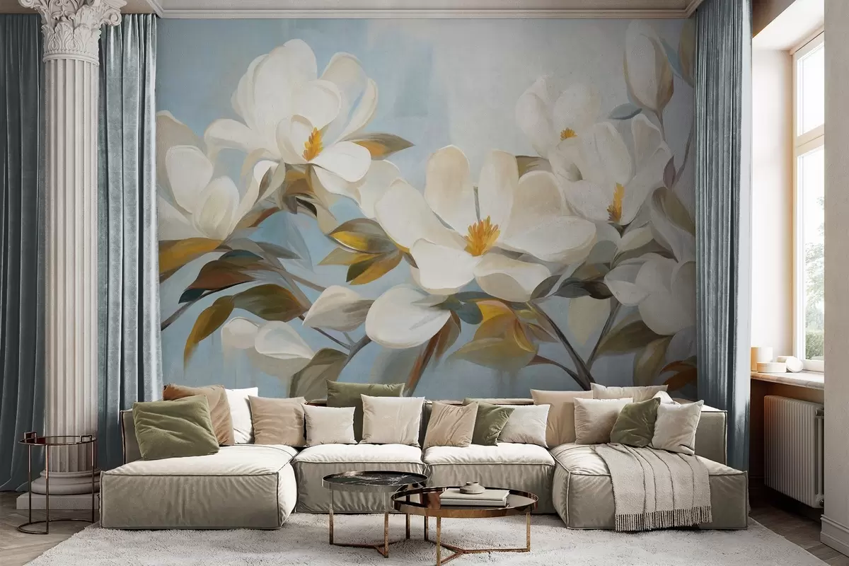 Fototapeta Białe magnolie z zielonymi liśćmi na jasnoniebieskim tle z abstrakcyjnymi pociągnięciami pędzla imitującymi Nr w09478