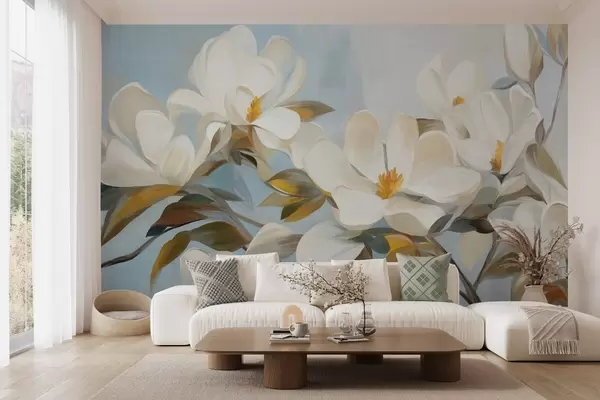 Fototapeta Białe magnolie z zielonymi liśćmi na jasnoniebieskim tle z abstrakcyjnymi pociągnięciami pędzla imitującymi Nr w09478