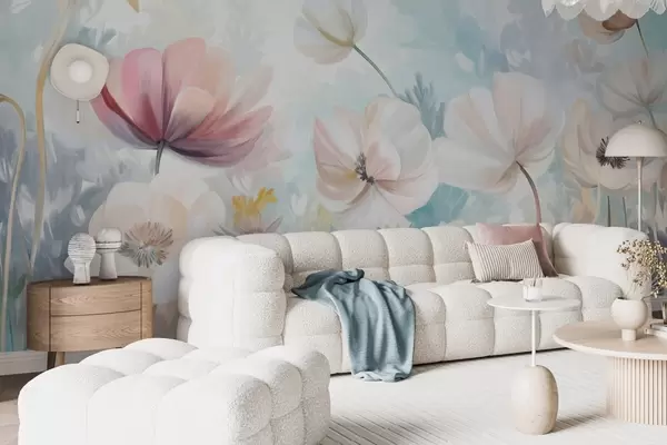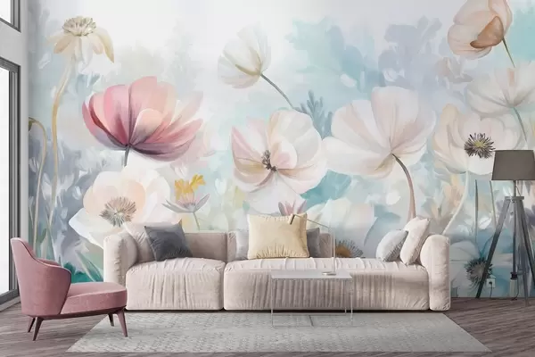 Fototapeta Pole kwiatów w pastelowych kolorach o delikatnych płatkach i miękkich zielonych liściach, namalowane w marzycielskim stylu akwareli z fakturą Nr w09481