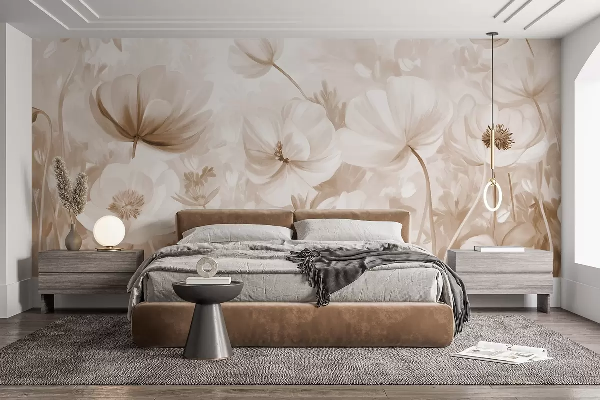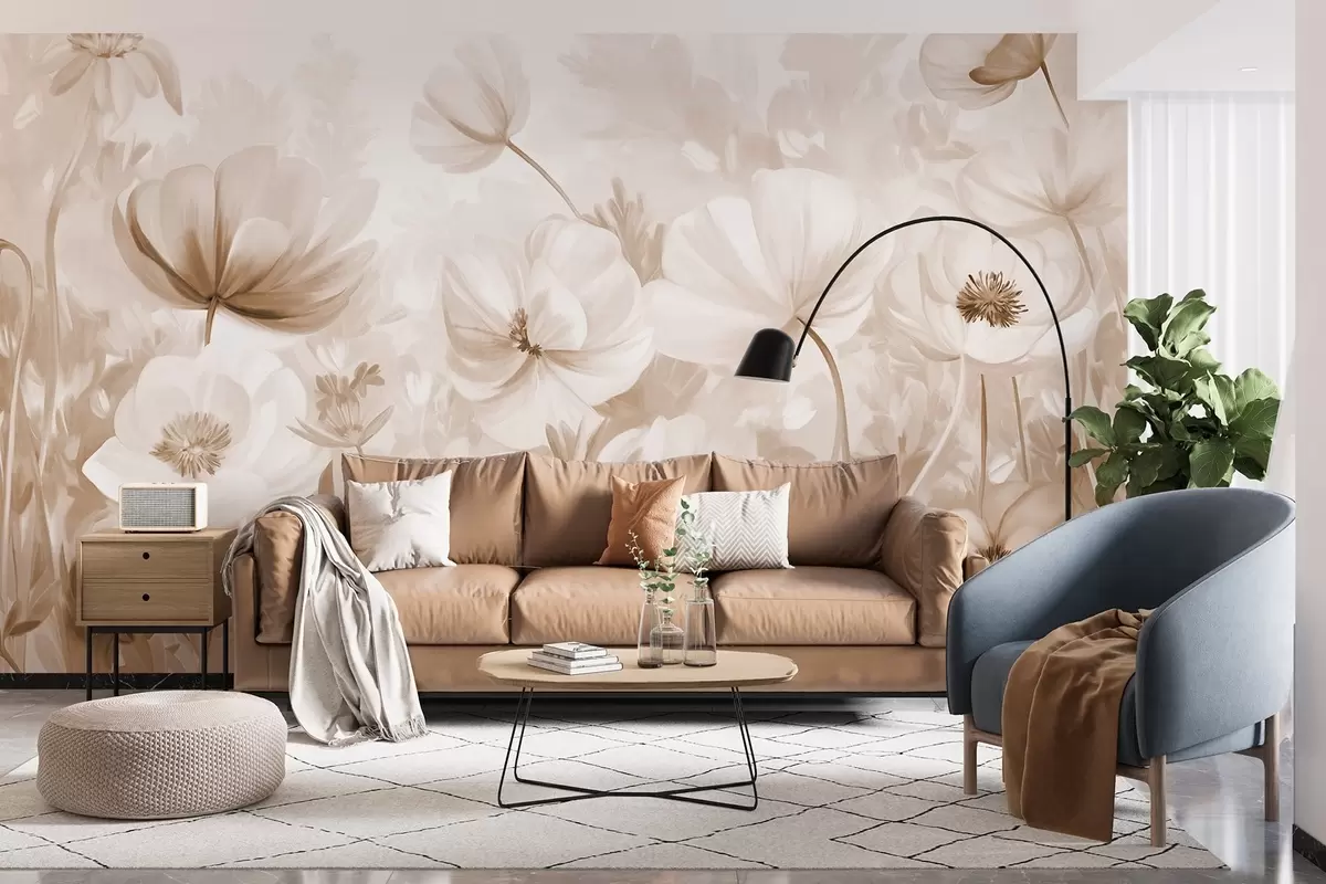Fototapeta Pole beżowych kwiatów o delikatnych płatkach i miękkich brązowych liściach, namalowane w marzycielskim stylu akwareli z wyraźną fakturą Nr w09481v1