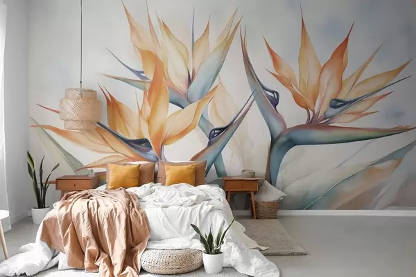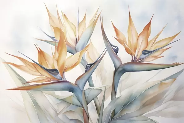 Fototapeta Kwiat rajskiego ptaka, strelicja z pomarańczowymi płatkami, delikatna akwarelowa faktura, jasne tło Nr w09483