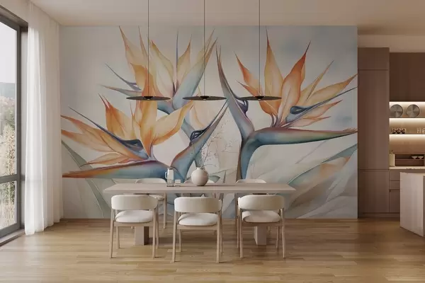 Fototapeta Kwiat rajskiego ptaka, strelicja z pomarańczowymi płatkami, delikatna akwarelowa faktura, jasne tło Nr w09483