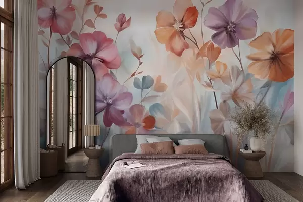 Fototapeta Kompozycja kwiatowa o fakturalnej strukturze, zawierająca różowe, fioletowe i pomarańczowe kwiaty z zielonymi łodygami i liśćmi, utrzymana w delikatnej pastel Nr w09486