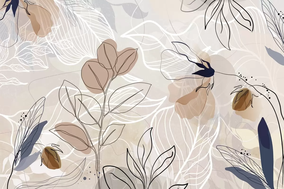 Fototapeta Beżowe abstrakcyjne tło z liśćmi i kwiatami, nowoczesne, minimalistyczne, organiczne kształty, botaniczny nadruk Nr w09487