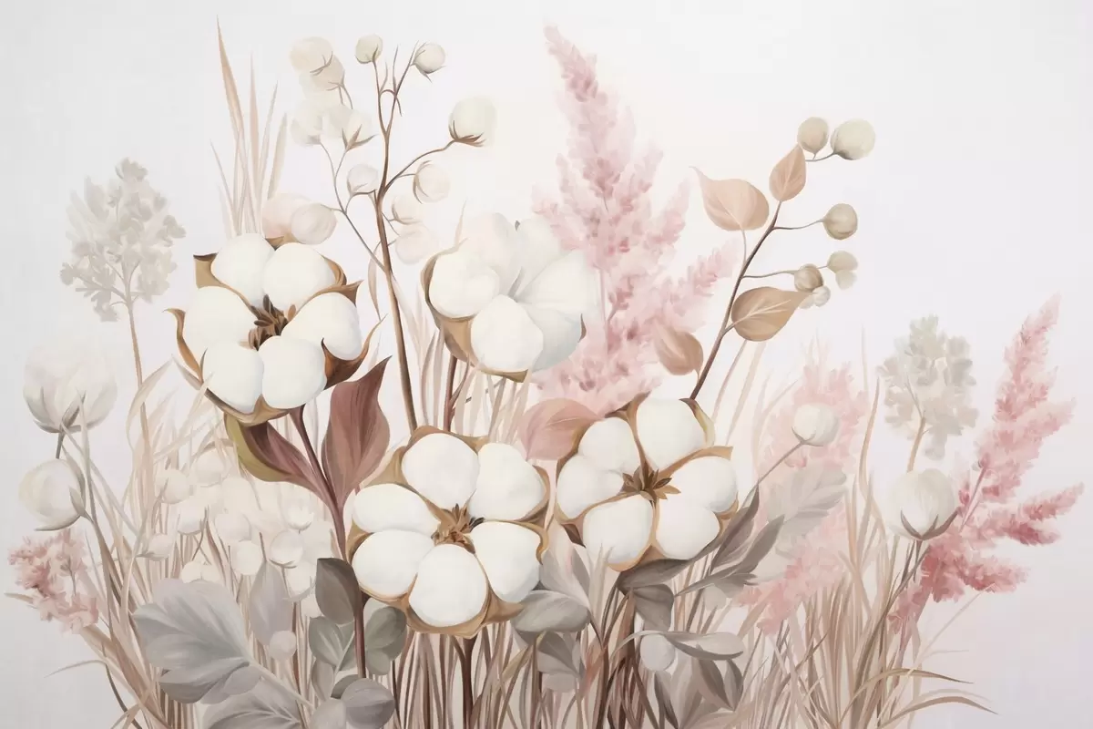 Fototapeta Kwiaty o fakturze bawełny z białą i różową trawą pampasową, beżowymi i brązowymi liśćmi oraz ziołami, białe tło Nr w09489