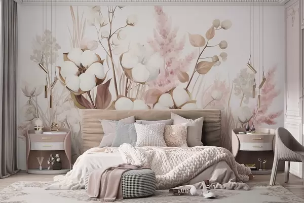 Fototapeta Kwiaty o fakturze bawełny z białą i różową trawą pampasową, beżowymi i brązowymi liśćmi oraz ziołami, białe tło Nr w09489