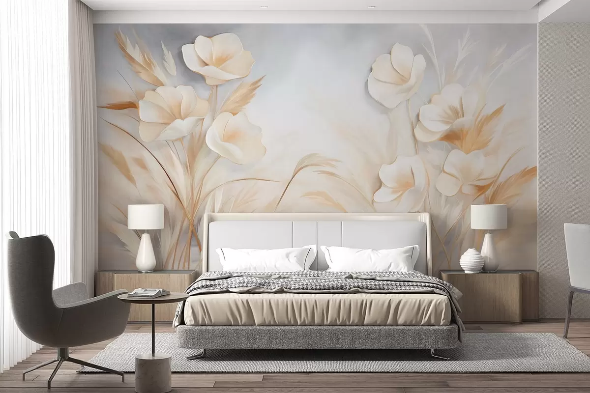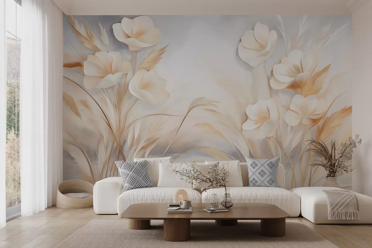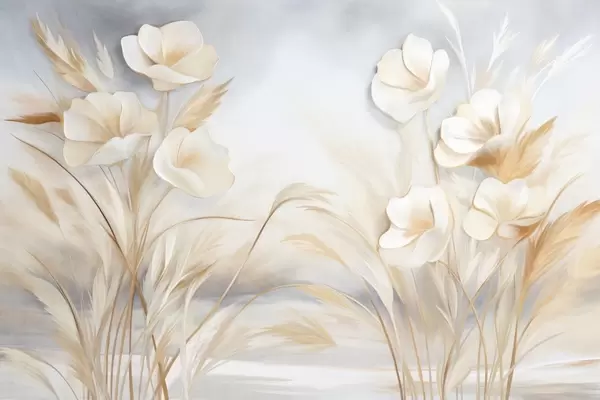 Fototapeta Białe kwiaty, beżowe trzciny i trawa pampasowa, teksturowane, eleganckie, minimalistyczny styl, abstrakcyjne tło krajobrazowe Nr w09490