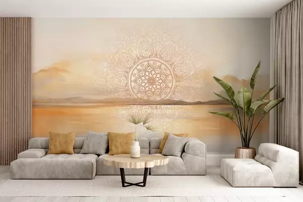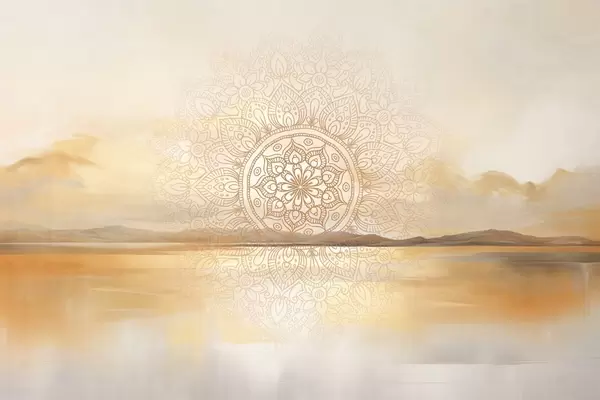 Fototapeta Teksturowany, symetryczny wzór mandali nakładający się na krajobraz z morzem, wzgórzami i niebem, w delikatnych pastelowych kolorach Nr w09491