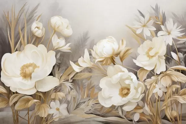 Fototapeta Białe i żółte piwonie oraz inne kwiaty z wysoką trawą i liśćmi w delikatnym, malarskim stylu. Nr w09494