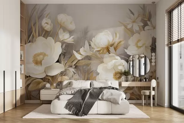 Fototapeta Białe i żółte piwonie oraz inne kwiaty z wysoką trawą i liśćmi w delikatnym, malarskim stylu Nr w09494