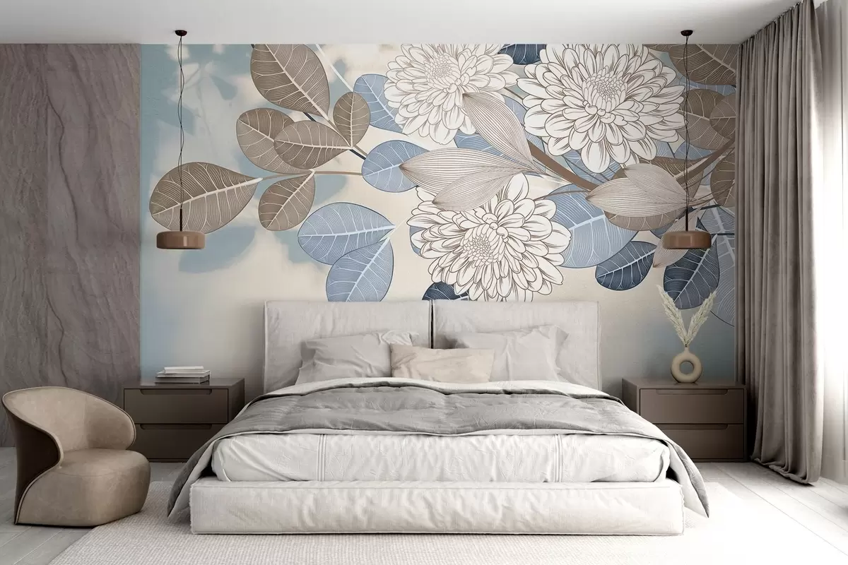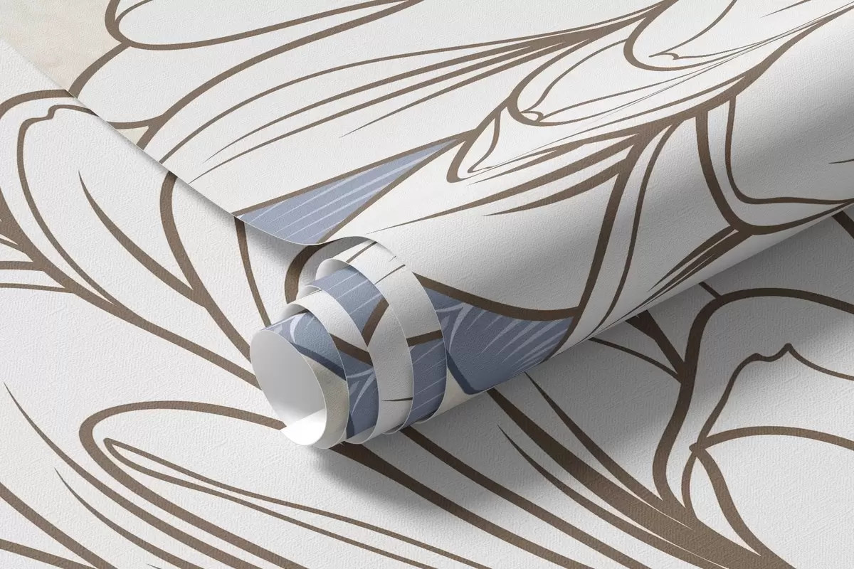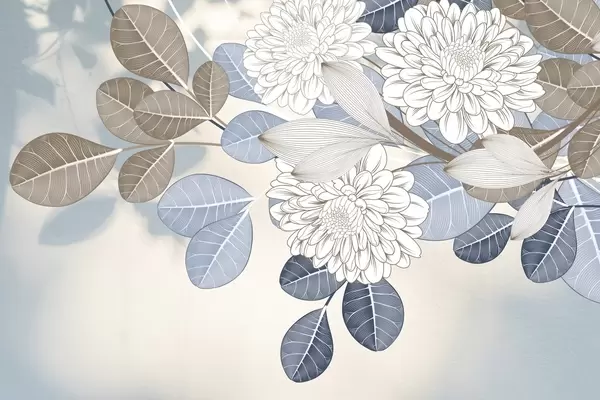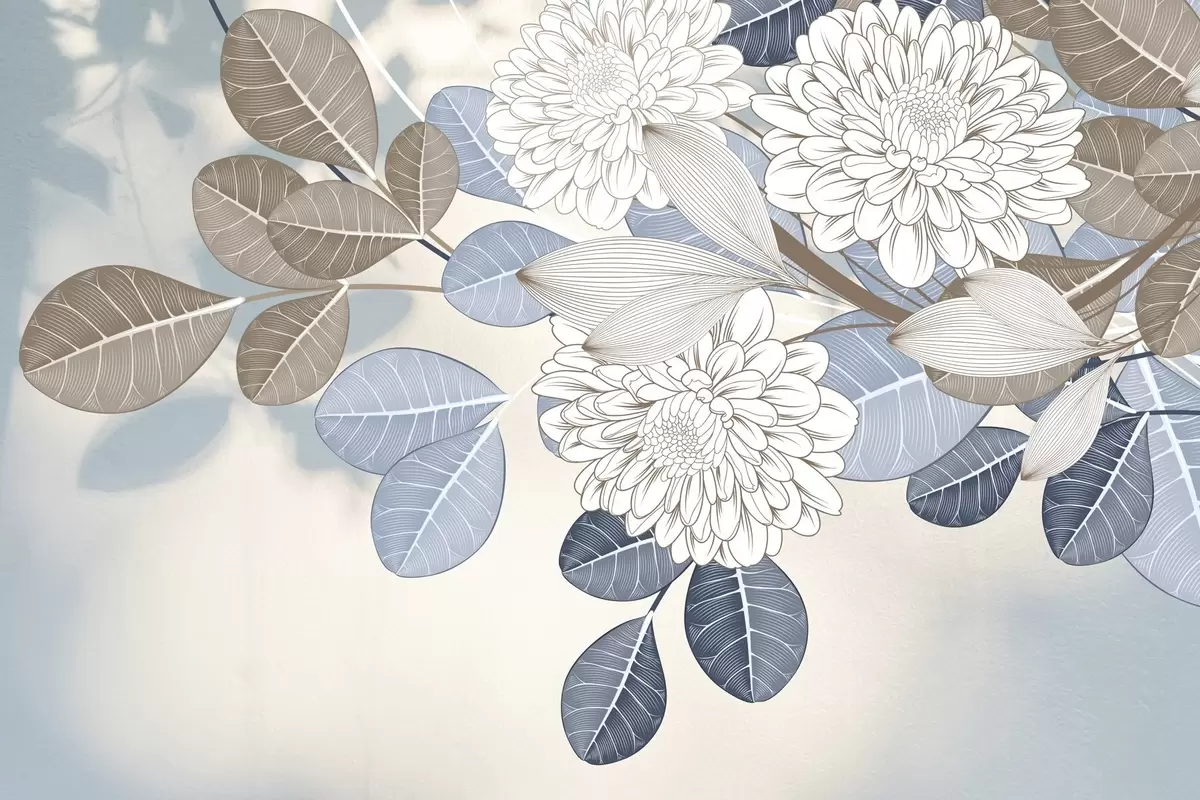 Fototapeta Białe kwiaty z niebieskimi i brązowymi liśćmi, jasnoniebieskie teksturowane tło, kompozycja kwiatowa, szczegółowa grafika liniowa Nr w09496