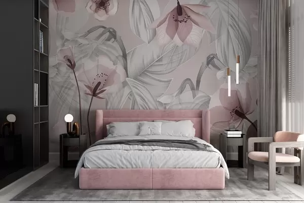 Fototapeta Różowe kwiaty i szare liście, kwiatowe tło botaniczne, elegancki wzór, delikatne kolory, lekkie, subtelne detale Nr w09497